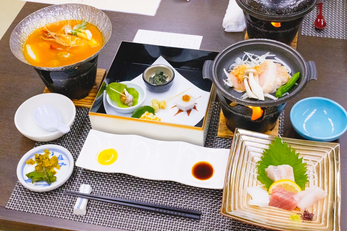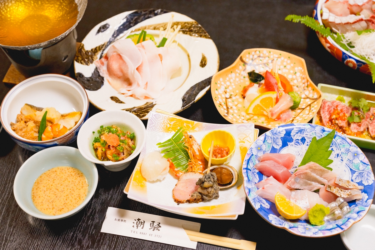 夕食は島民にも人気の「お食事処 潮騒」で。サワラ、キビナゴといった刺身や、しゃぶ鍋、トビウオの唐揚げなどが付いて見事なボリューム感!地産地消のグルメをいただきながら、旅の話にも花が咲きます。