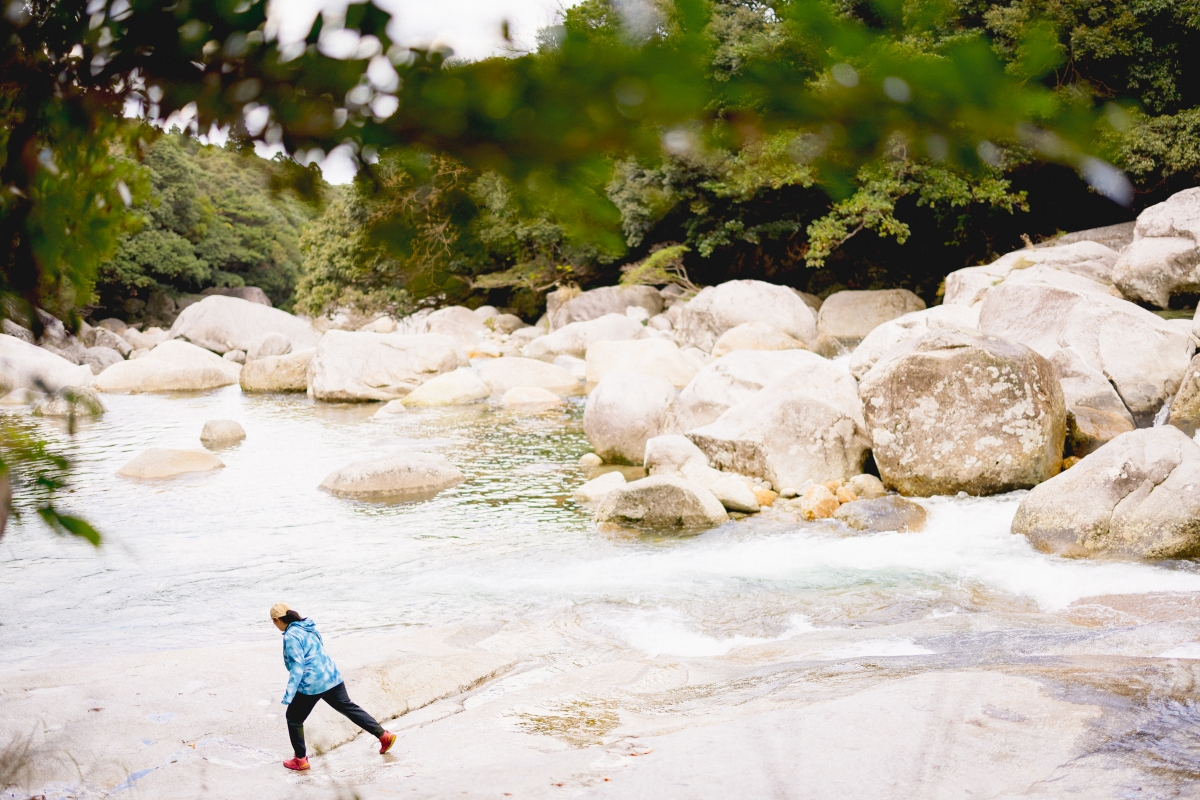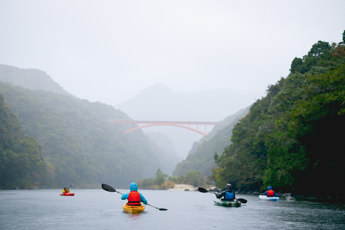多雨な屋久島。雨の日は、川面の雨音をしっとりと感じ、屋久島らしい表情を味わいながら川を上ります。出発から約40分漕ぎ進めて、水面から約70mの高さに架かる赤い橋・松峯大橋を眺める中洲に着いたところで、折り返し。晴れた日なら太平洋から昇るサインライズも楽しめます。