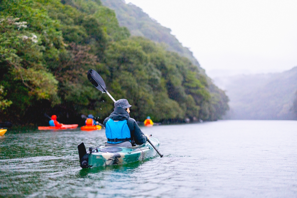 アクティビティは、安房川でのカヤックがおすすめ。インストラクターの東さんからパドルレクチャーを受け、一人一艘のカヤックに乗り込みます。カヤック未経験でもソロ操船は可能。両岸の切り立った岩肌や、かつての山城跡などを眺めながらゆうゆうと川を上ります。
