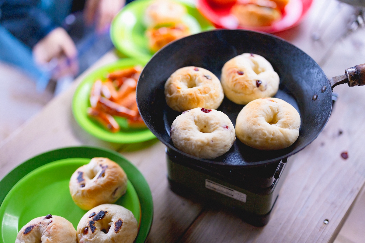 カヤックの後は、お楽しみの朝食タイム。今回はテイクアウトしたベーグルと、ウインナーをサンドして焼いたバターロールを用意し、波の音、潮の香りを感じながら手作りのご飯をいただきました。