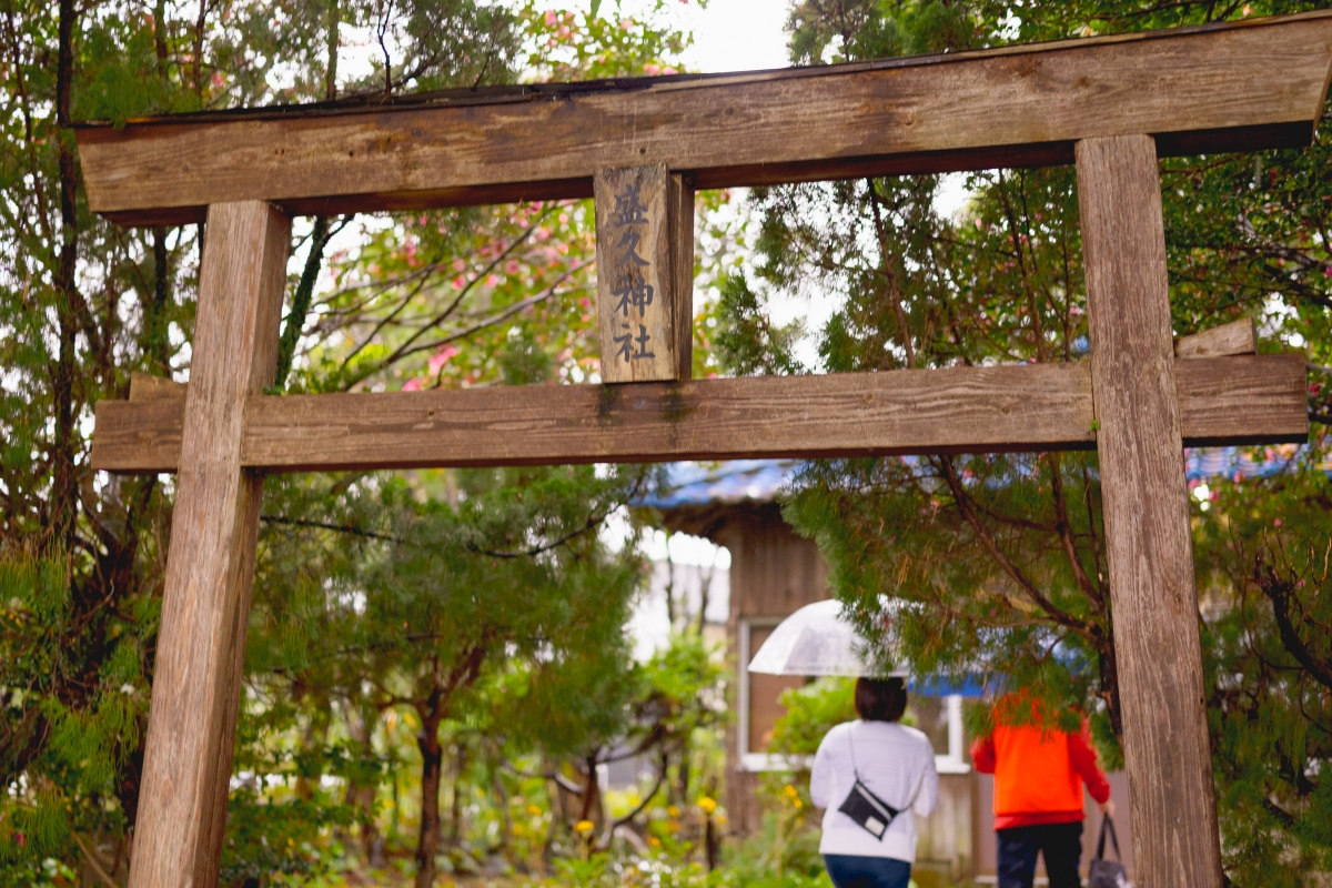 社内奥に並ぶ仁王像は、かつて明治の廃仏毀釈の動きによって破壊の危機に遭遇しましたが、霊験ある像として島民に信奉されていたために、有志によって土に埋めて隠され、危機が去った後に再び掘り起され、改めて奉納されるようになったという歴史をもちます。