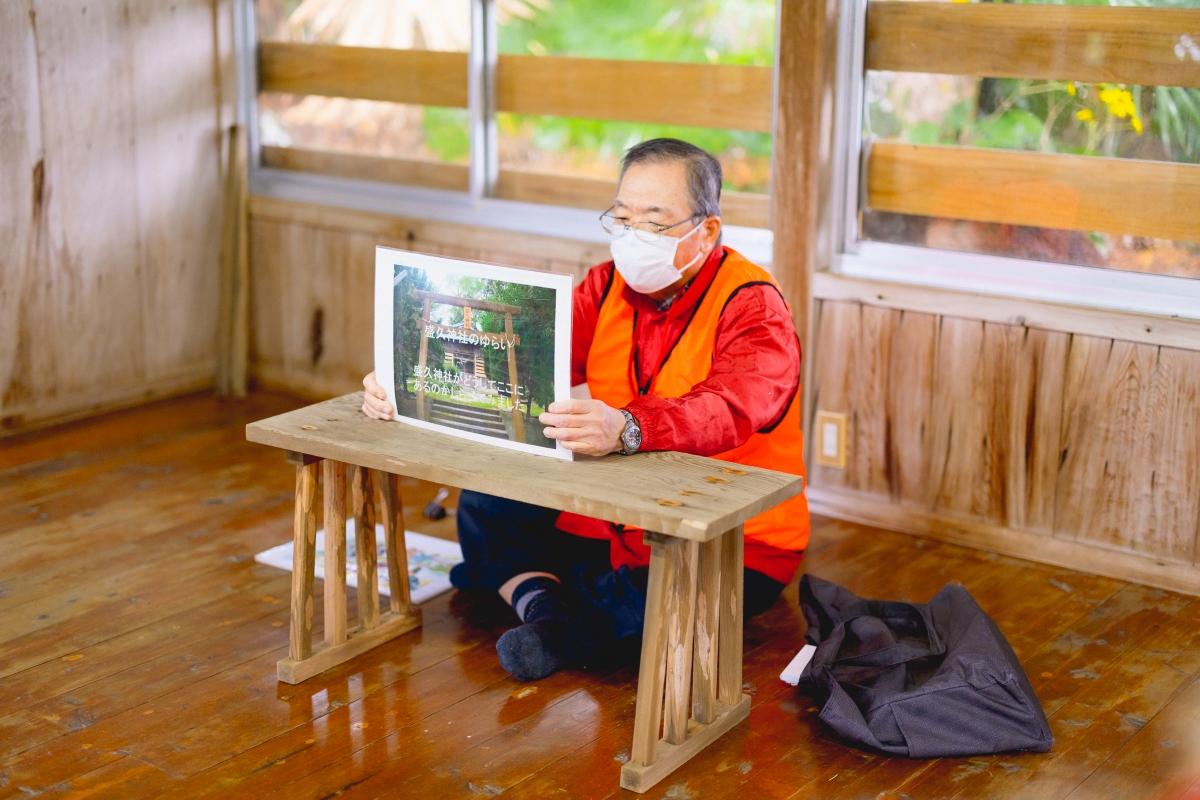 「盛久神社」から春牧集落里めぐりをスタート。迎えてくださったのは語り部の澤田さん。温かみある紙芝居で、盛久神社の由来である平盛久と屋久島の逸話について解説してくださいました。盛久神社には、源平合戦での敗走後、硫黄島で息絶えたとされる盛久の霊がまつられています。