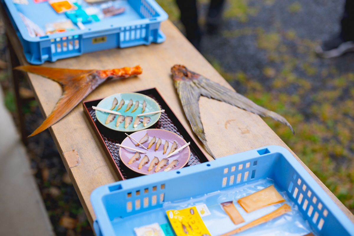 「けい水産」は、トビウオをはじめ魚の燻製に特化した店として島内随一の人気を誇ります。島の特産トビウオを独自商品化。口に入れると春風のように燻製の香が抜ける"生ハム"風や、"ハーブ味"などを試食させていただきました。シイラやアオリイカの燻製も販売しています。