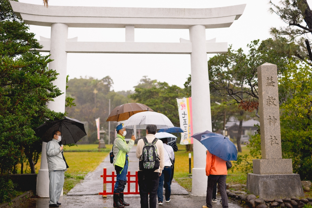 続いて「宮之浦集落」を里めぐり。世界自然遺産登録記念の碑や、歴史民俗資料館、江戸時代の屋久島奉行所跡などがあり、かつての島の行政の中心地であった集落の歴史を探訪します。由緒ある社格をもつ益救神社から、屋久島里めぐり語り部、田代さんの案内で里めぐりスタート。