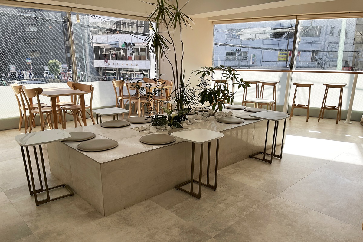 白を基調に、木材をふんだんに使った店内は、シンプルながら温かみのある雰囲気。1・2階合わせて50席が設けられ、ゆったりと過ごすことができます。