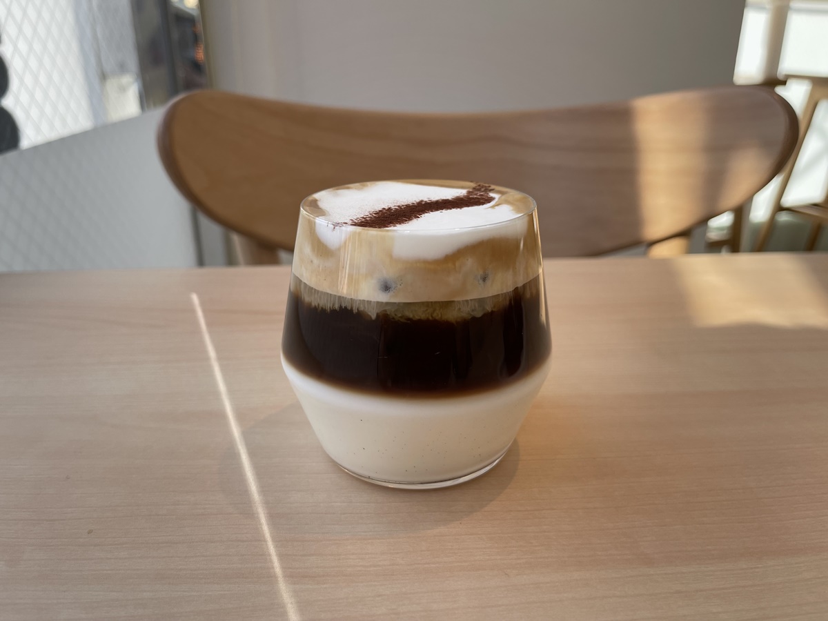 フィナンシェのお供には、シグネチャードリンクの「グウムラテ」750円をどうぞ。ほろ苦いエスプレッソの香りに、バタースコッチシロップのコクのある甘さがよく合います。