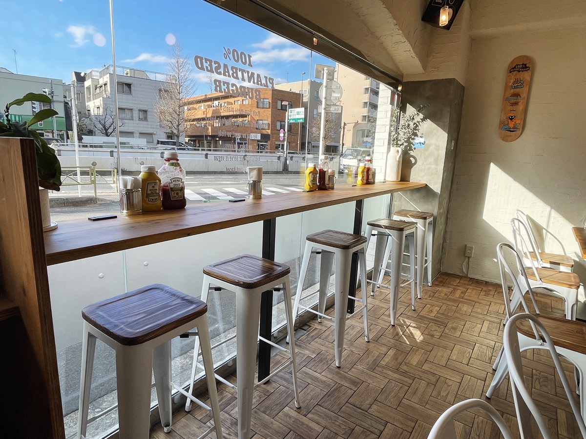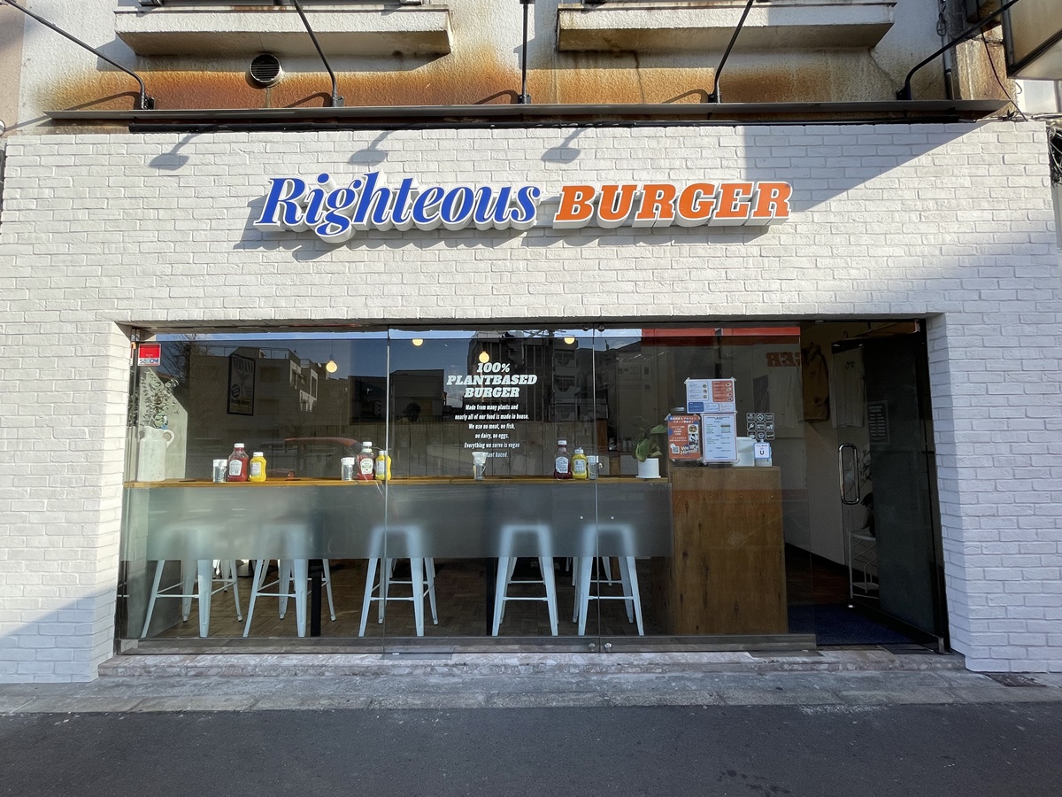 用賀駅から徒歩で約10分、二子玉川駅からも約15分の玉川通り沿いにオープンしたヴィーガンバーガー専門店「Righteous Burger(ライチャス バーガー)」。