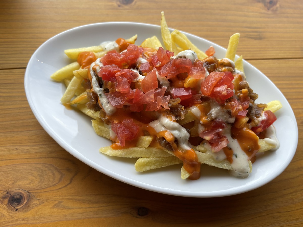 サイドメニューのイチ押しは「ジャングルフライ」648円。熱々の揚げたてポテトに、サウザンドソースとランチソースの2種類のソース、ローストオニオン、トマト、ヴィーガンチーズをトッピングしたボリューミーなひと皿。