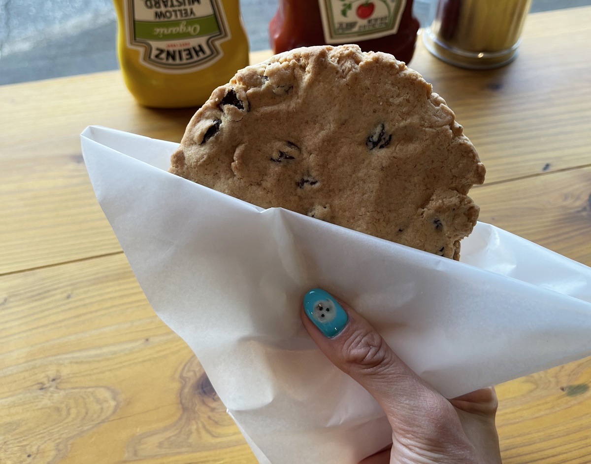 大人の手のひらサイズほどもある大きなクッキーはプレーン、チョコ、チョコチップ、レーズンの4種類。全粒粉を使用していて、ザクザクとした食感が楽しめます。