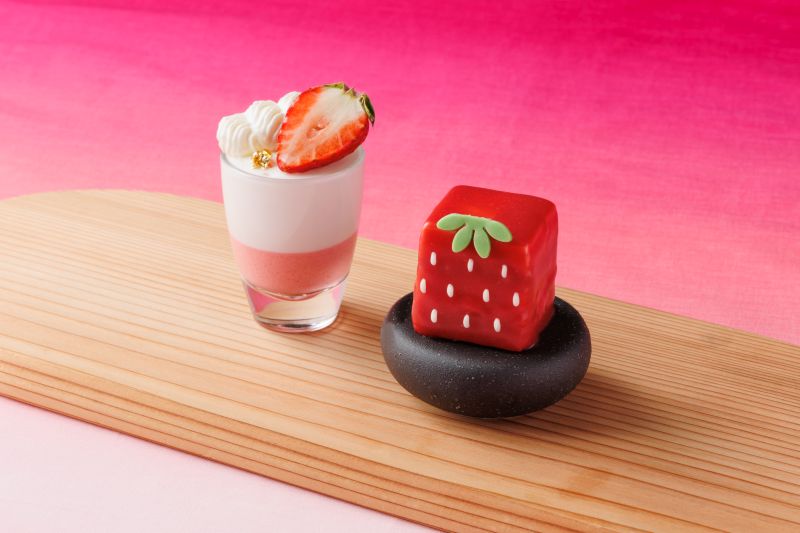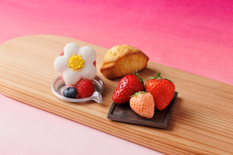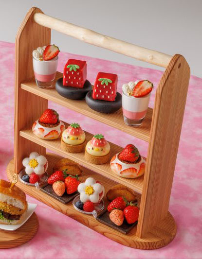 「あすかルビー」と「古都華」、このふたつのブランドいちごをたっぷりと堪能できるメニュー構成の今回のアフタヌーンティーは、同じく奈良県産の吉野杉を使用したオリジナルスタンドで提供されます。