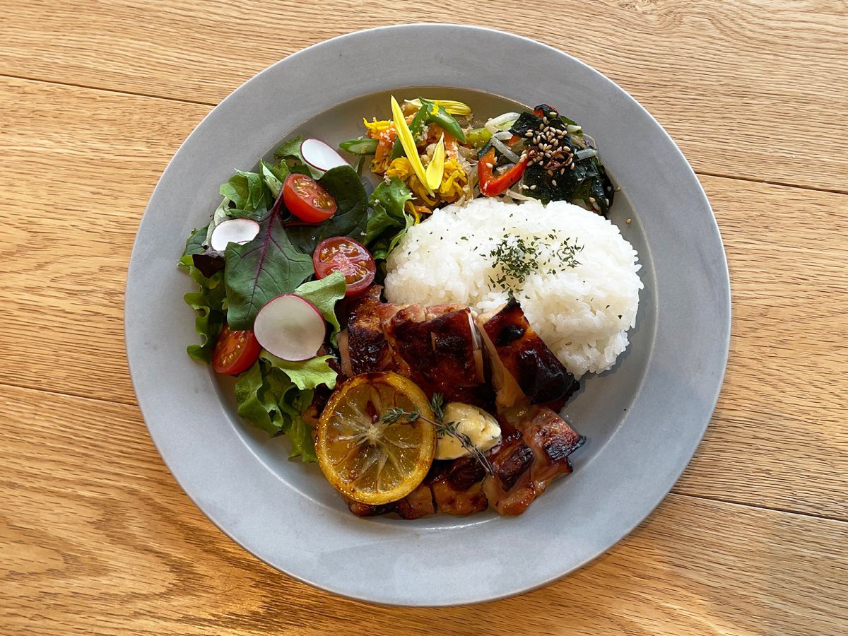 取材時は岩手県産の菜彩鶏(さいさいどり)の塩麹焼き、三陸産のわかめを使用したナムル、菊のくるみ和えなどが一皿に。