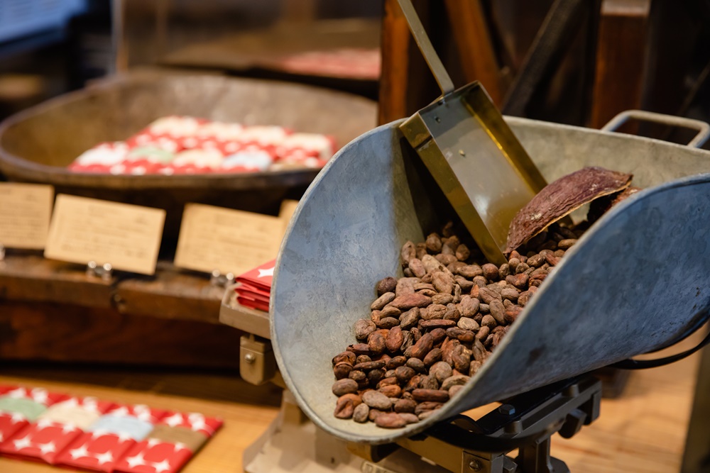 カカオレートを並べたテーブルの上に鎮座するアンティークの秤。使い込まれた金属の質感が存在感を放ちます。