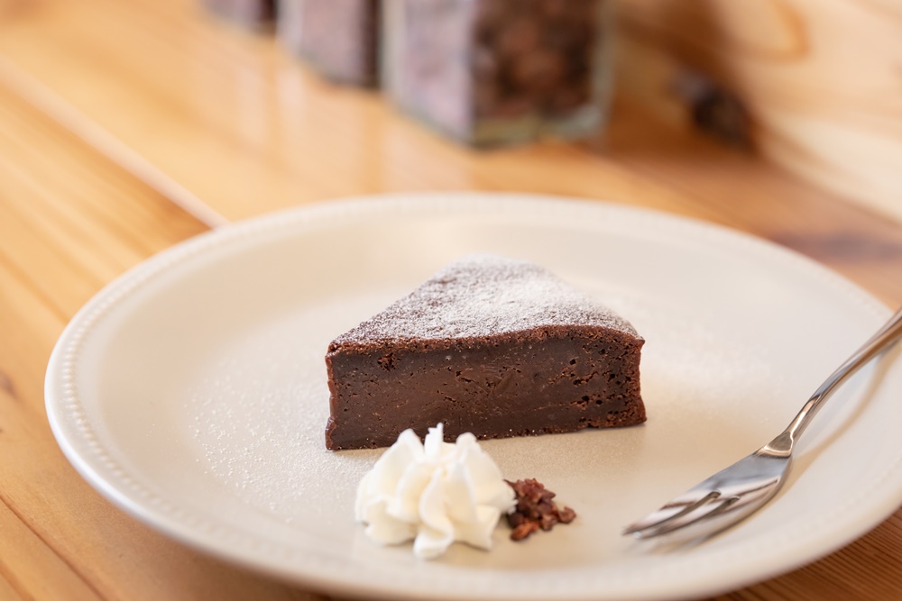 食べごたえ十分のどっしり食感がうれしいカカオレートのガトーショコラ750円。濃厚なコクとベリーのような独特の香りが口の中で溶け合います。香り高いエチオピア産のアンドロメダコーヒーを隠し味に使い、国産のてんさい糖で仕上げた素朴な甘さが魅力です。