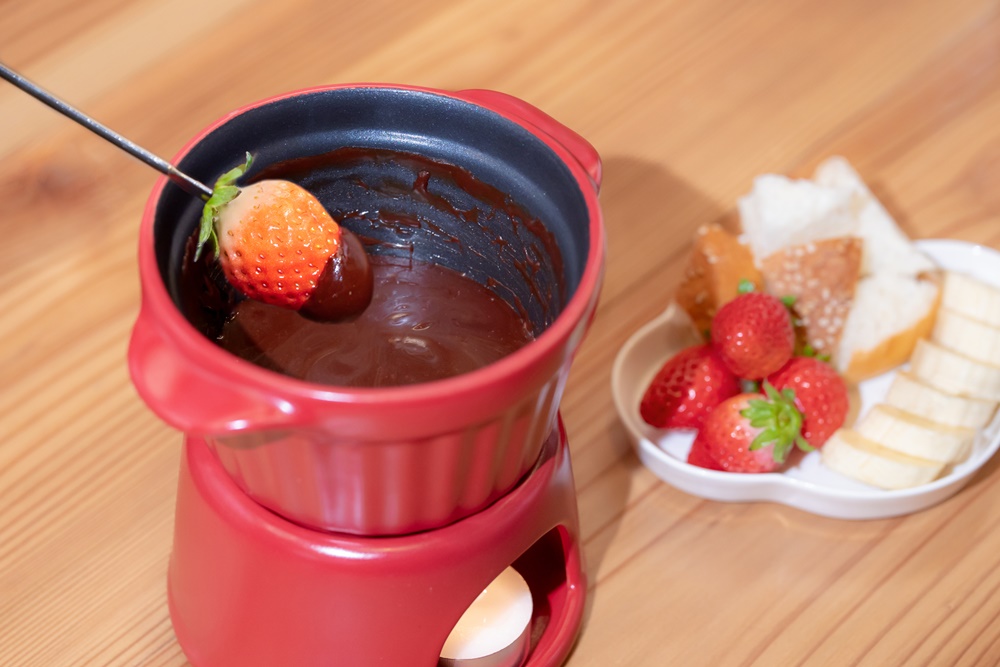 季節限定の「カカオレートフォンデュ」1000円は、イチゴとバナナ、パンを温かいカカオレートに浸していただく贅沢な一品。とろとろのカカオレートをたっぷりつけて、お気に入りの組み合わせを探してみて。