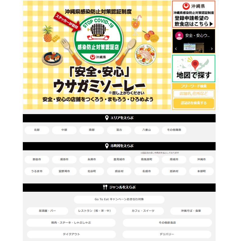 「認証店」は「沖縄県感染防止対策認証制度 公式サイト(下記バナー)」より簡単に調べることができます。掲載店舗は随時更新中。公式サイト上で、エリア・市町村・ジャンル等を選択すると、条件に合ったお店を提案してくれます。事前に旅行の計画をする際にはもちろん、旅行中でも、要件に合ったお店を現在地から探し出せるので、とっても便利。沖縄を訪れるなら、ぜひブックマークを忘れずに!