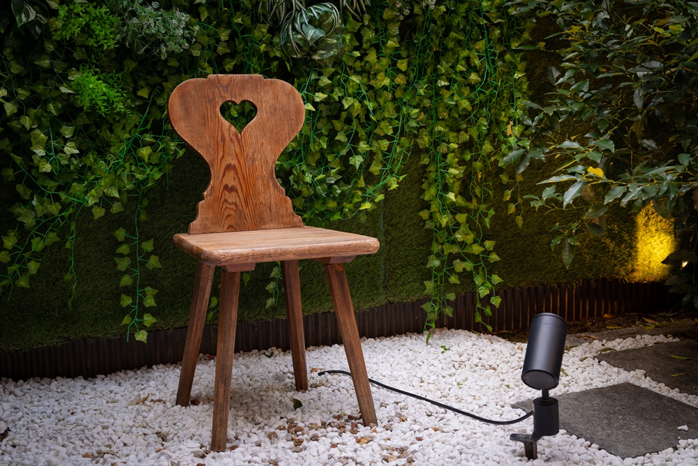 店内奥には、すてきなお庭もあります。自由に出入りOKで、写真もOKです。背部分がハートの形にくりぬかれたキュートなイスにパフェを置いて写真を撮ったら、SNS映え間違いなし。京都の思い出作りにもピッタリです。