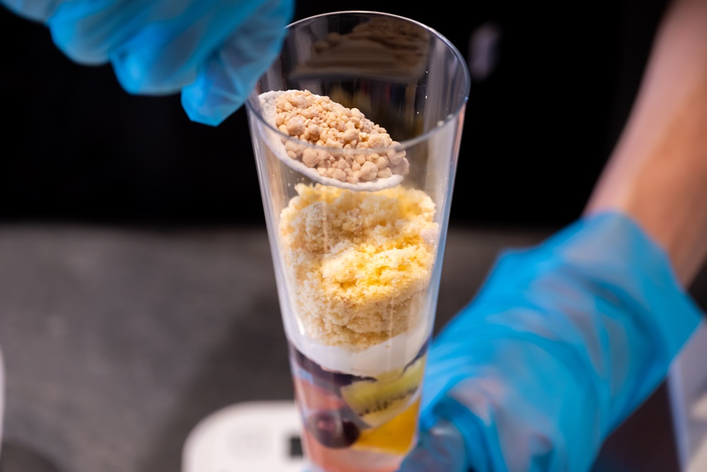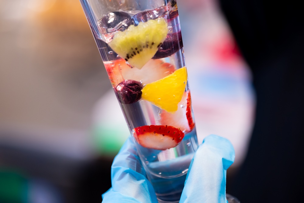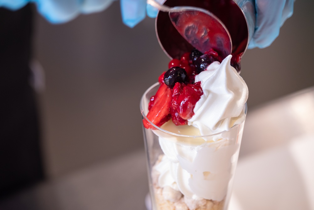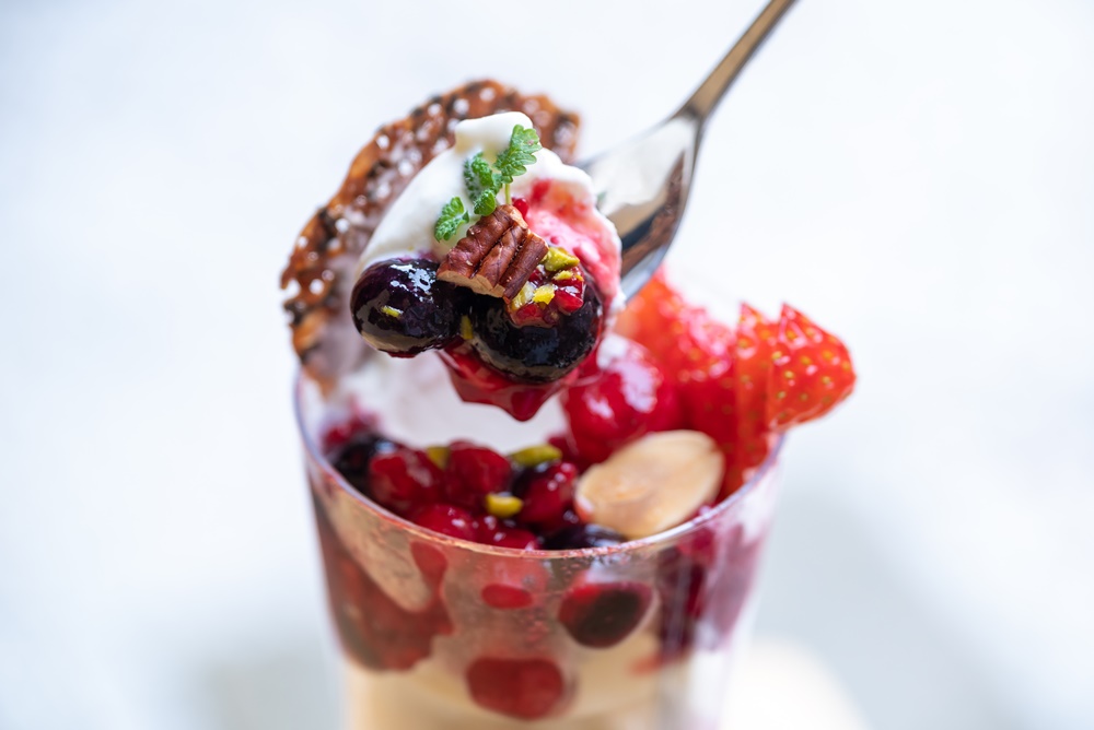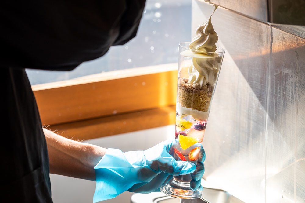 一番上の層にかかるのは、半冷凍のフルーツと京都の人気カフェ「北野ラボ」特製のコンフィチュールを混ぜ合わせたものです。使用するフルーツは、できるだけ減農薬・無農薬にこだわり、パフェに合う品種を厳選。ソフトクリームとの相性も抜群です。