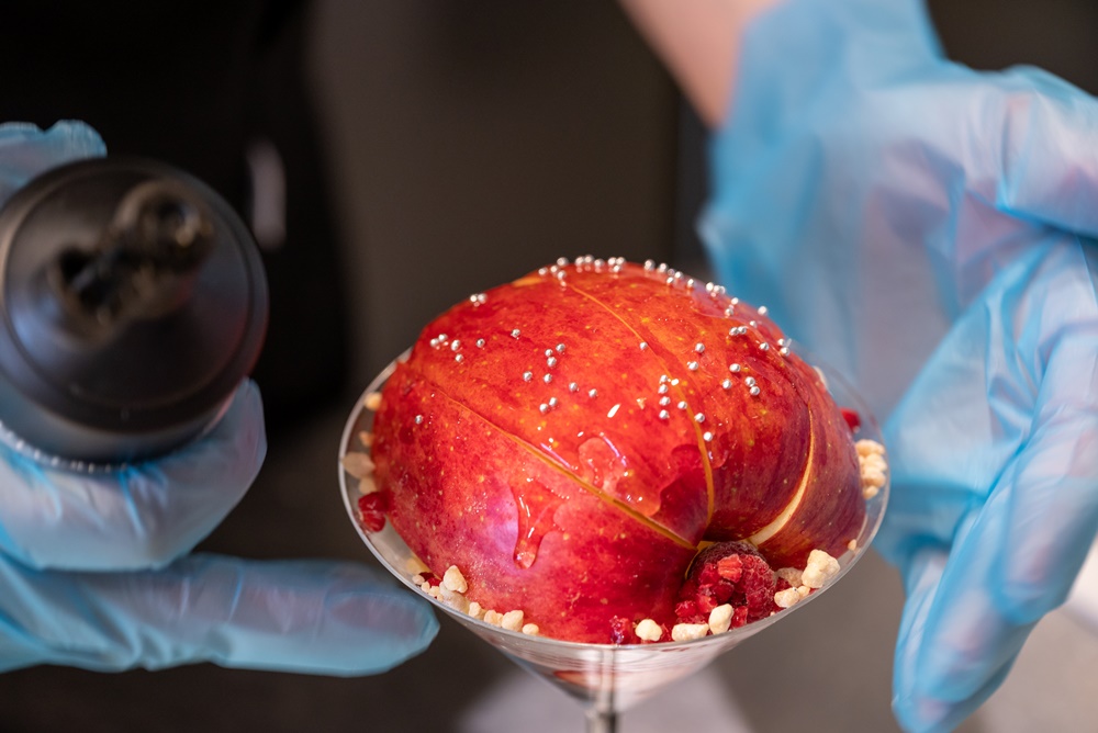 次に、季節限定商品の「国産りんごとフランボワーズのパフェ」1430円。2023年2月現在、4月~5月くらいまで提供予定です。国産のりんごがどんと半玉乗った迫力満点の一品。りんごには国産のはちみつがたっぷり塗られていて、上にはアラザンがぱらり。