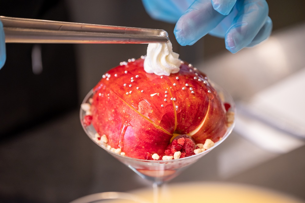 アラザンによって見た目が華やかになることはもちろん、ガリっとした食感がアクセントに。甘いりんごと酸味のあるフランボワーズで、最後の一口まで飽きることなく楽しめます。食べごたえも満点。