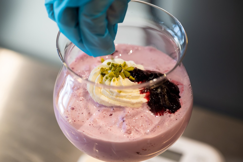 パフェも魅力的ですが、ドリンクもこだわりのものが揃います。「ハスカップのシェイク」1650円は、ハスカップのコンフィチュール・ソフトクリーム・牛乳を混ぜたもの。ハスカップは「不老長寿の実」と呼ばれるほど栄養豊富な果物ですが、柔らかく潰れやすいため流通が困難。CLASSLOBEでは、冷凍の状態で仕入れてコンフィチュールに加工しているので、ありのままの味をたのしむことができます。