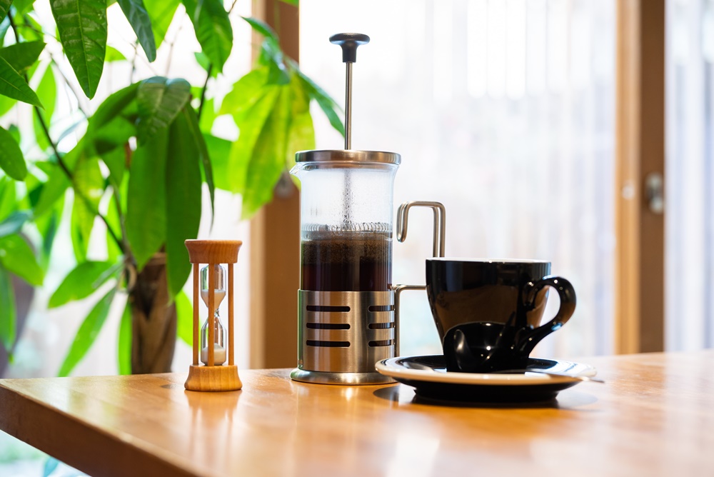 「ブレンドコーヒー」605円は、京都の人気店「粉屋珈琲」の珈琲豆(浅煎り)を使用。風味豊かでまろやかな味わいが特徴です。フレンチプレスで提供されるスタイルで、提供時、何が始まるの?とワクワクされる方も多いそう。店内はワンオーダー制ですが、パフェはシェア可能なので、それぞれドリンクを楽しみながら、パフェをシェアするのもいいですね。