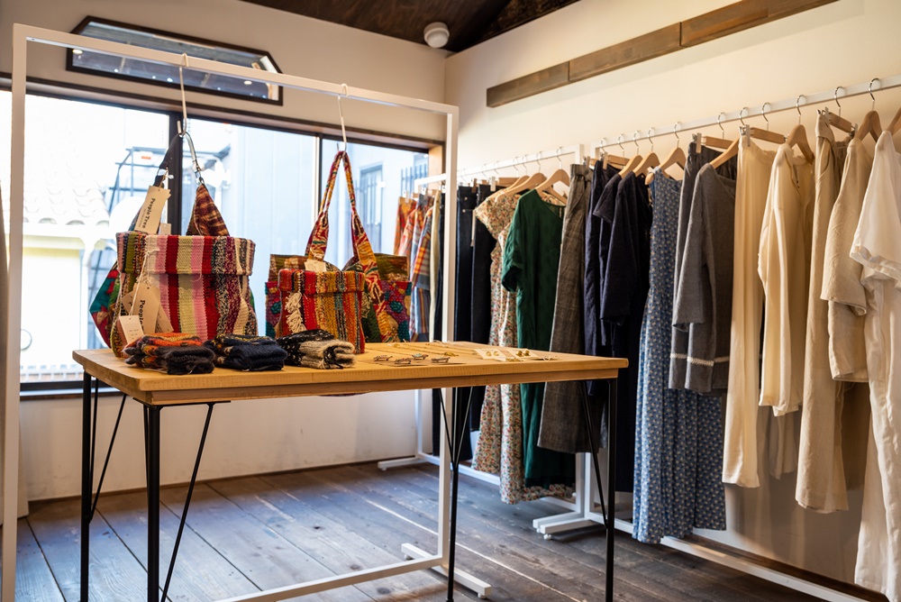 吹き抜けの店内の2階では、アパレルやライフスタイル雑貨等を販売。オーガニックコットンを中心に、サトウキビを絞ったあとに残る繊維「バガス」のポテンシャルを最大限に生かしたアパレルや、車の廃材をアップサイクルしたバッグなど地球にやさしいアイテムが並びます。