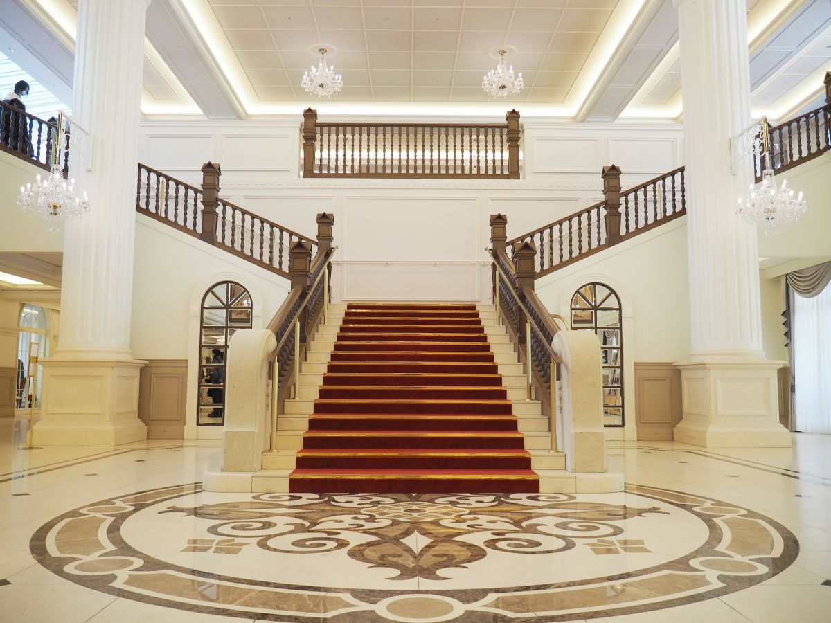 宝塚ホテルで、ぜひ見ておきたいのが、ひときわ優雅なエントランス。宝塚大劇場の大階段を思わせる赤絨毯の階段、きらびやかなシャンデリア、宝塚大劇場で使用されていた緞帳など、どこをとっても映える空間となっています。