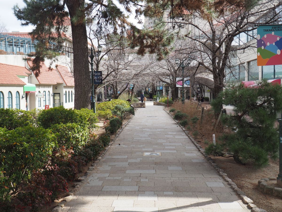宝塚駅周辺のお散歩で絶対に外せないのが「花のみち」。阪急宝塚駅から宝塚大劇場まで続く約430mの小径で、宝塚ホテルや周囲の商店街はヨーロッパ調の意匠で異国情緒いっぱい。季節の花々が植えられ、春には一面の桜が咲き誇る景色を見ることができます。