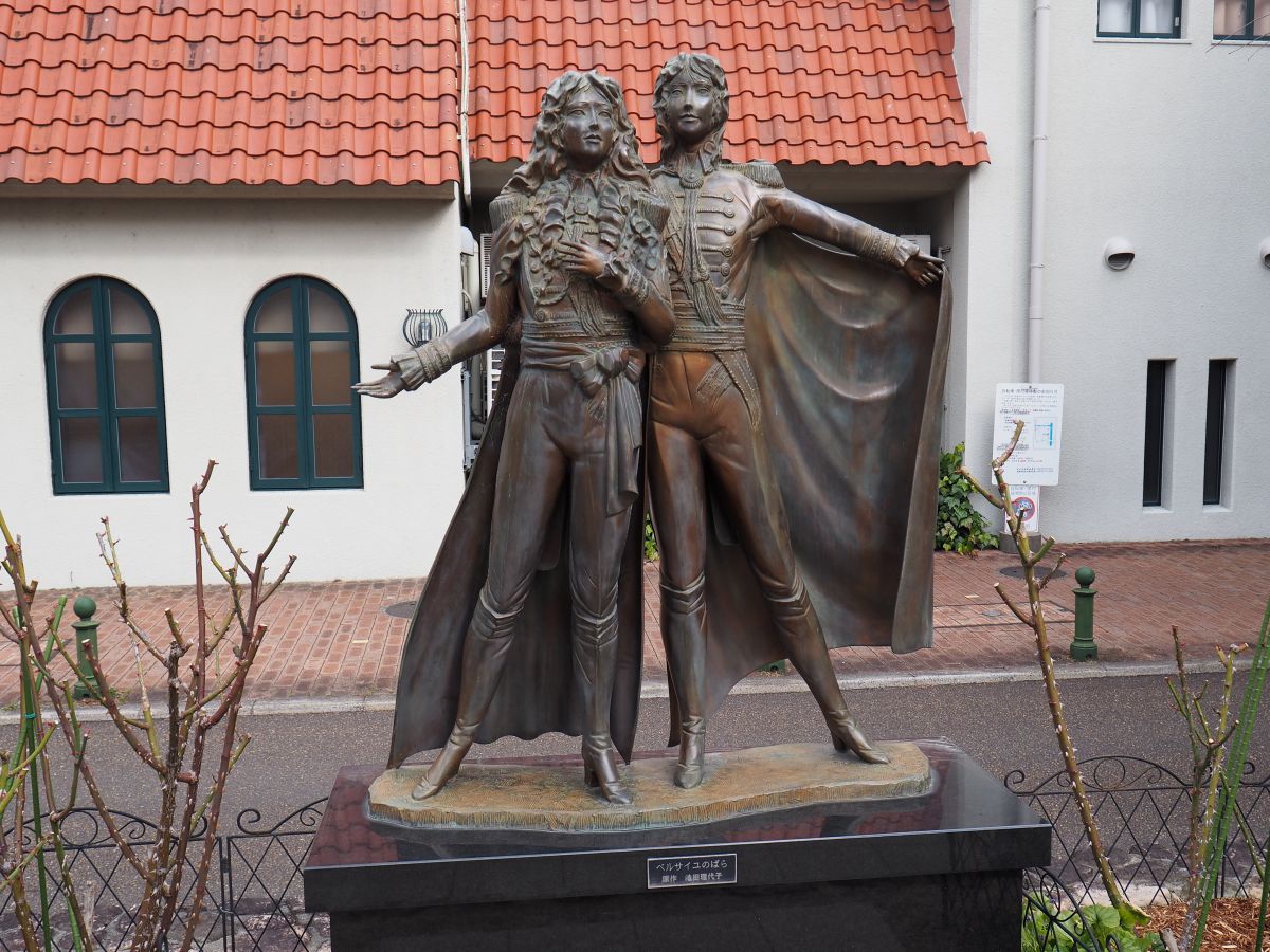 道中には、宝塚歌劇をモチーフにした銅像が3カ所に設置されているので、探してみてください。ぜひ見ておきたいのは、『ベルサイユのばら』の銅像。周囲にはバラが植えられており、シーズンになると赤いバラに囲まれたオスカルとアンドレを見ることができます。