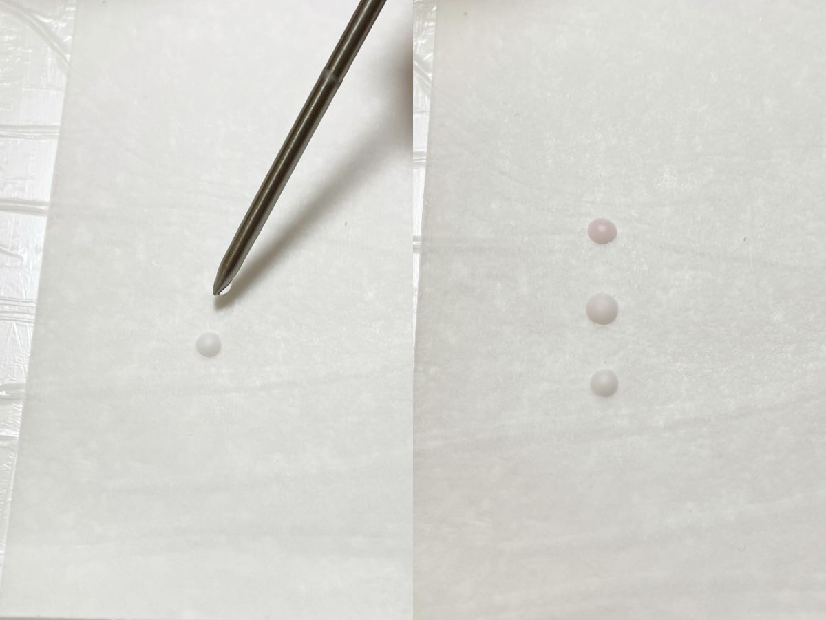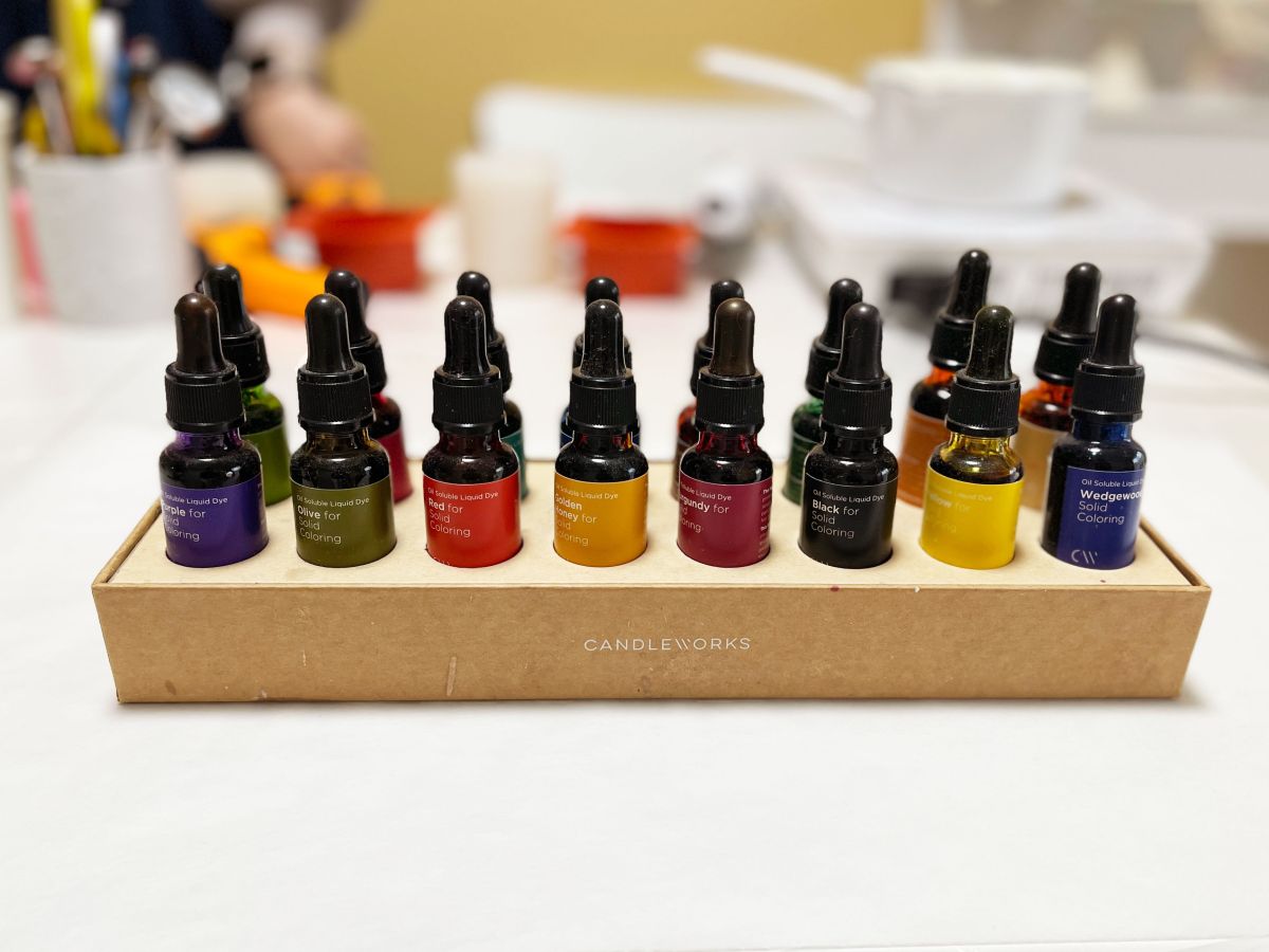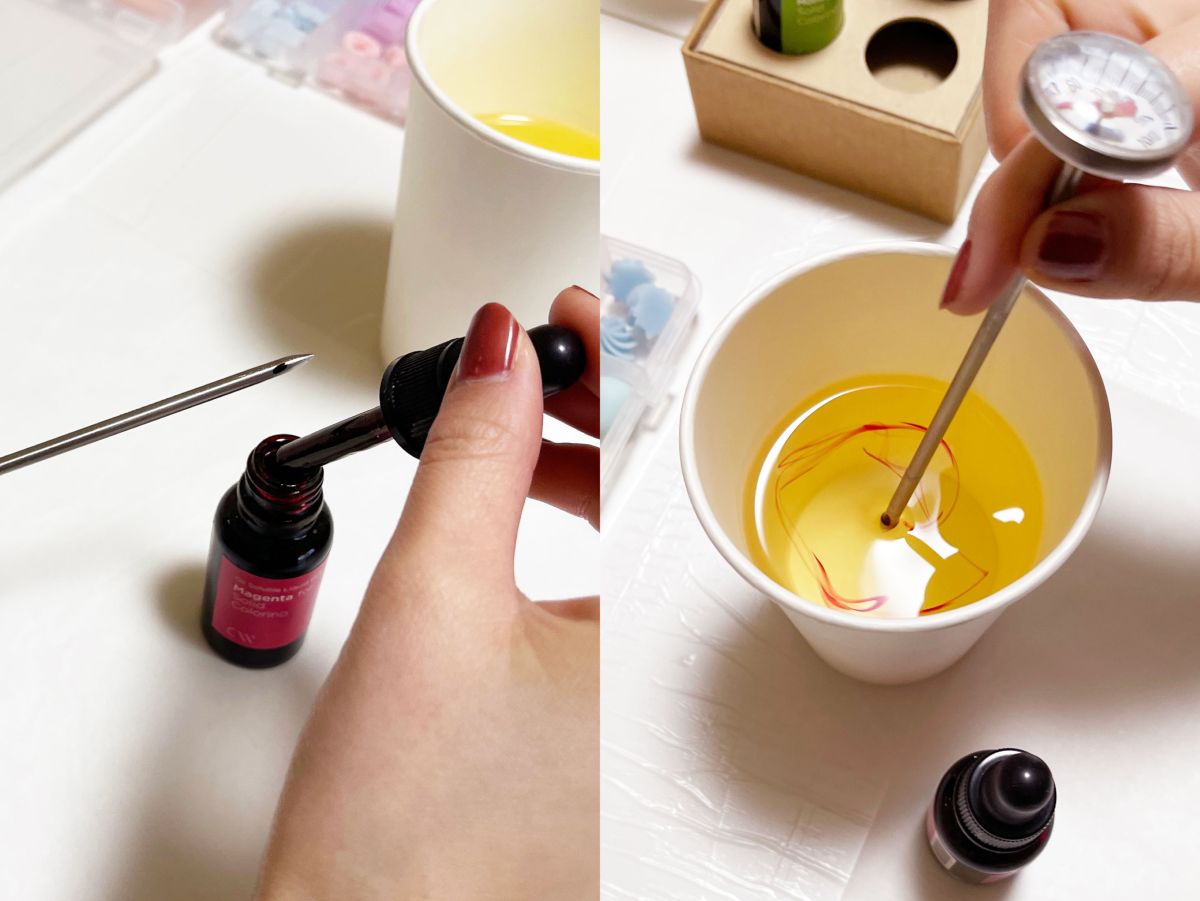 一滴だけロウをテーブルに垂らし、固まった色を見ながら少しずつカラー剤を加え、好みの色に近づけます。今回は3回加えたところでストップ!