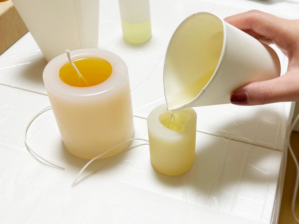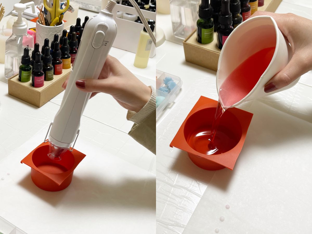 温まったら色と香りのついたロウを型いっぱいに流し込みます!
