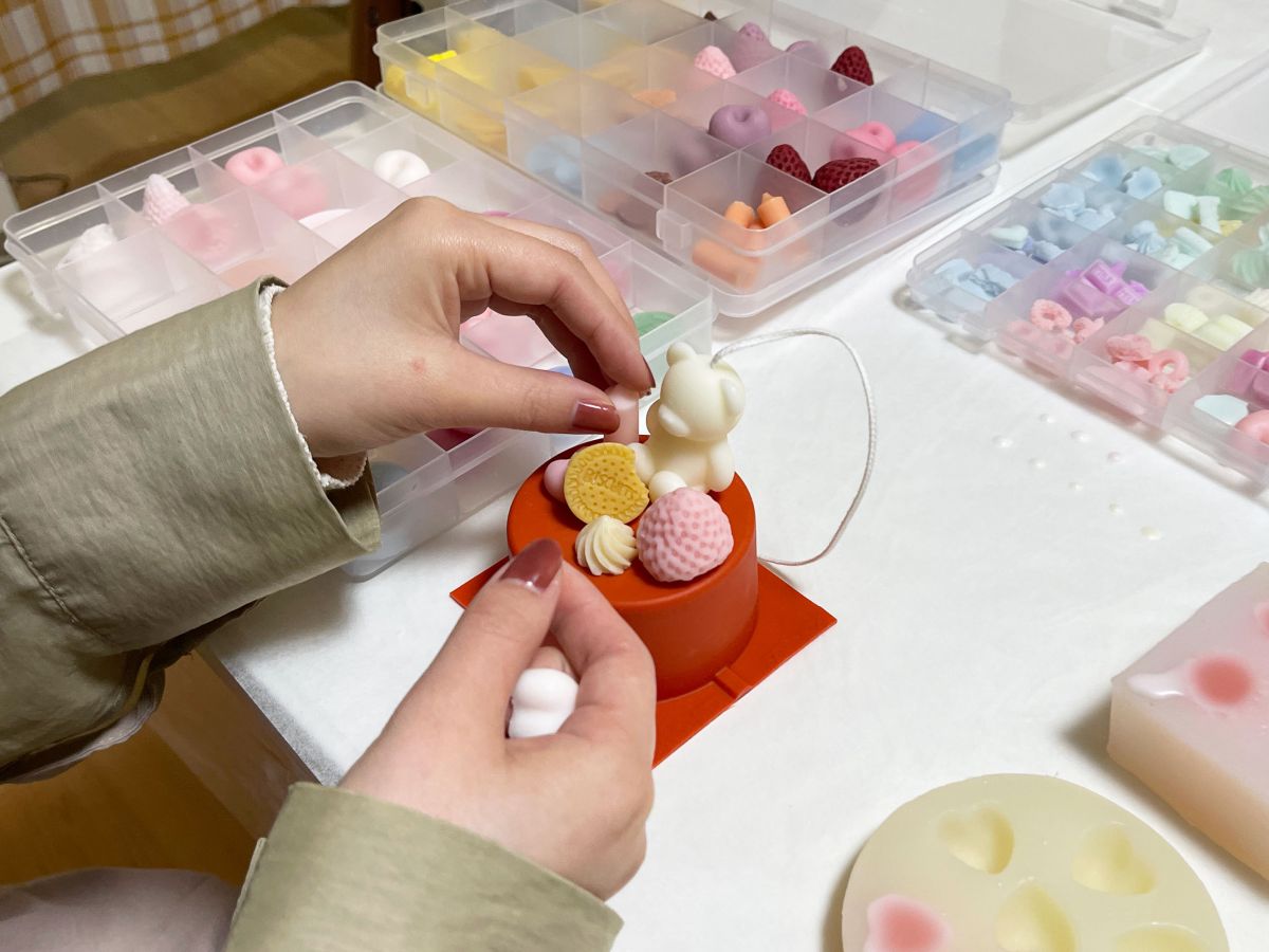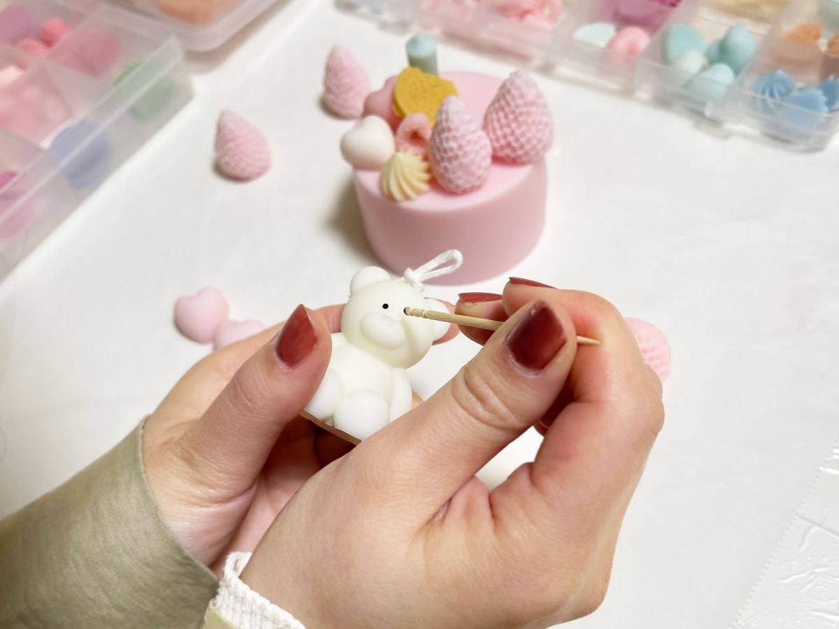 小さいクマのほかにも、パーツは自分で作ることが可能です。土台作りで余ったロウを使って同じ色のパーツを作れば、統一感もアップ!