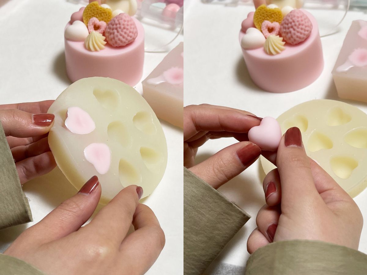 ケーキの土台が固まるのを待つ間に、デザインを考えながらパーツ選びを。こんなケーキにしようかなと、型の上にパーツをのせて構想を練っていきます。