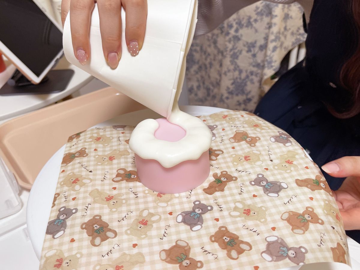 パーツが決まったら、ケーキの土台にクリームのロウを乗せます。側面に垂れている部分は先生が作ってくれるので安心。残りの部分を自分で埋めて、クリームは完了です!