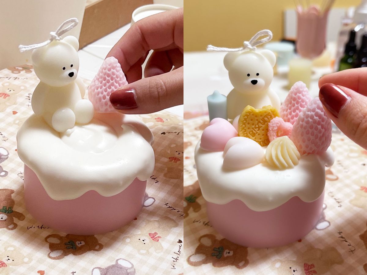 いよいよパーツを乗せていきます。自分で作ったクマちゃんも忘れずに。あらかじめ決めておいたパーツをのせて、オリジナルケーキキャンドルがついに完成!