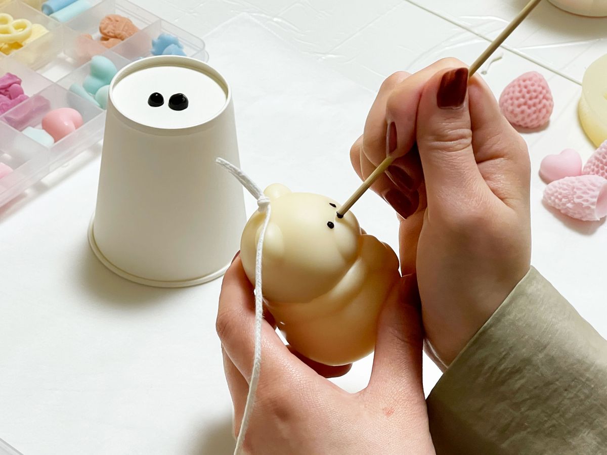 土台ができあがる頃に、先ほど作っておいた小さなクマキャンドルも固まりました。仕上げに、つまようじで目と鼻を黒く塗ったら完成♪