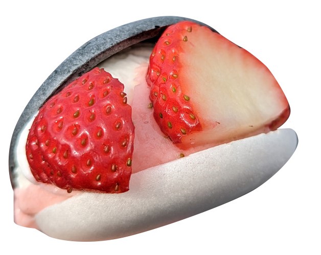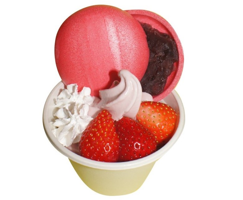 「道の駅 宇土マリーナ おこしき舘」のくまモングルメは、くまモンの色を取り入れた最中皮に餡を挟み、イチゴのソフトクリームにオン。さらに、イチゴやホイップクリームでデコレーションも施した、かわいいデザートです。