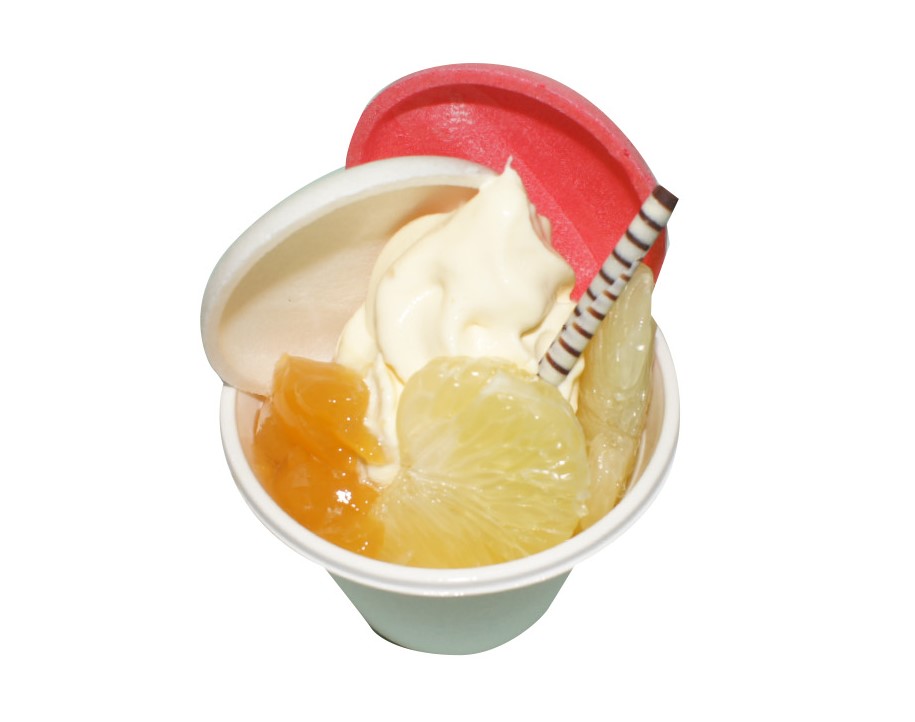道の駅有明で食べられるくまモングルメ。バニラソフトに、天草地方でとれた旬の柑橘の果肉やジャムなどをトッピング。爽やかな味わいです。