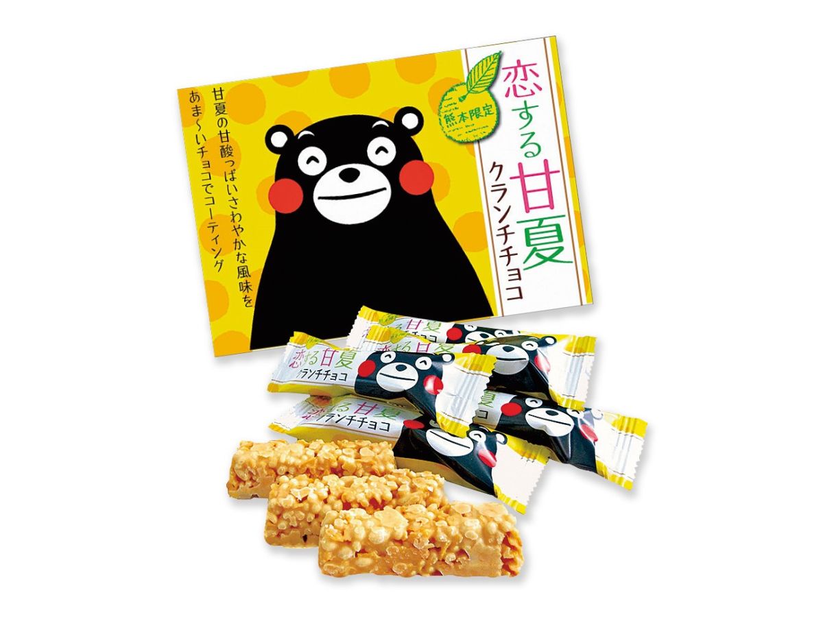 くまモンみやげの1つめのおすすめは、「恋する甘夏クランチチョコ」24本入り1080円。甘夏の甘酸っぱい爽やかな風味を甘いホワイトチョコでコーティング。くまモンパッケージもキュートな熊本限定商品です。軽くて日持ちするためおみやげに最適!