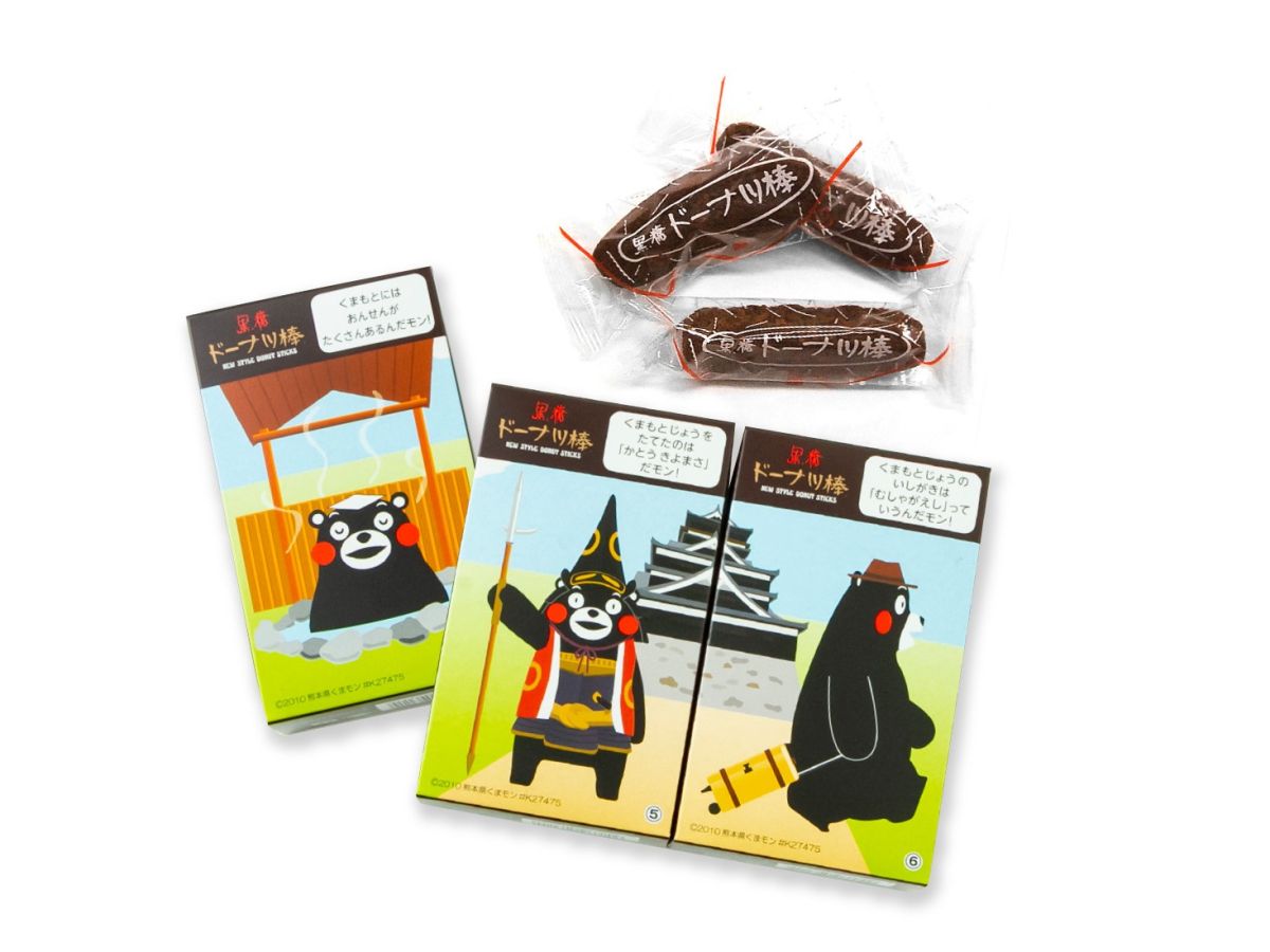 お次は、「黒糖ドーナツ棒くまモンパッケージ」1箱3本入り170円をご紹介。こちらは沖縄の含蜜黒糖を使用した棒状のドーナツです。こだわりの油で揚げており、外はサクッと、中はしっとり、優しい甘さが広がります。くまモンパッケージには6種類あり、6箱並べると熊本の大パノラマが完成!
