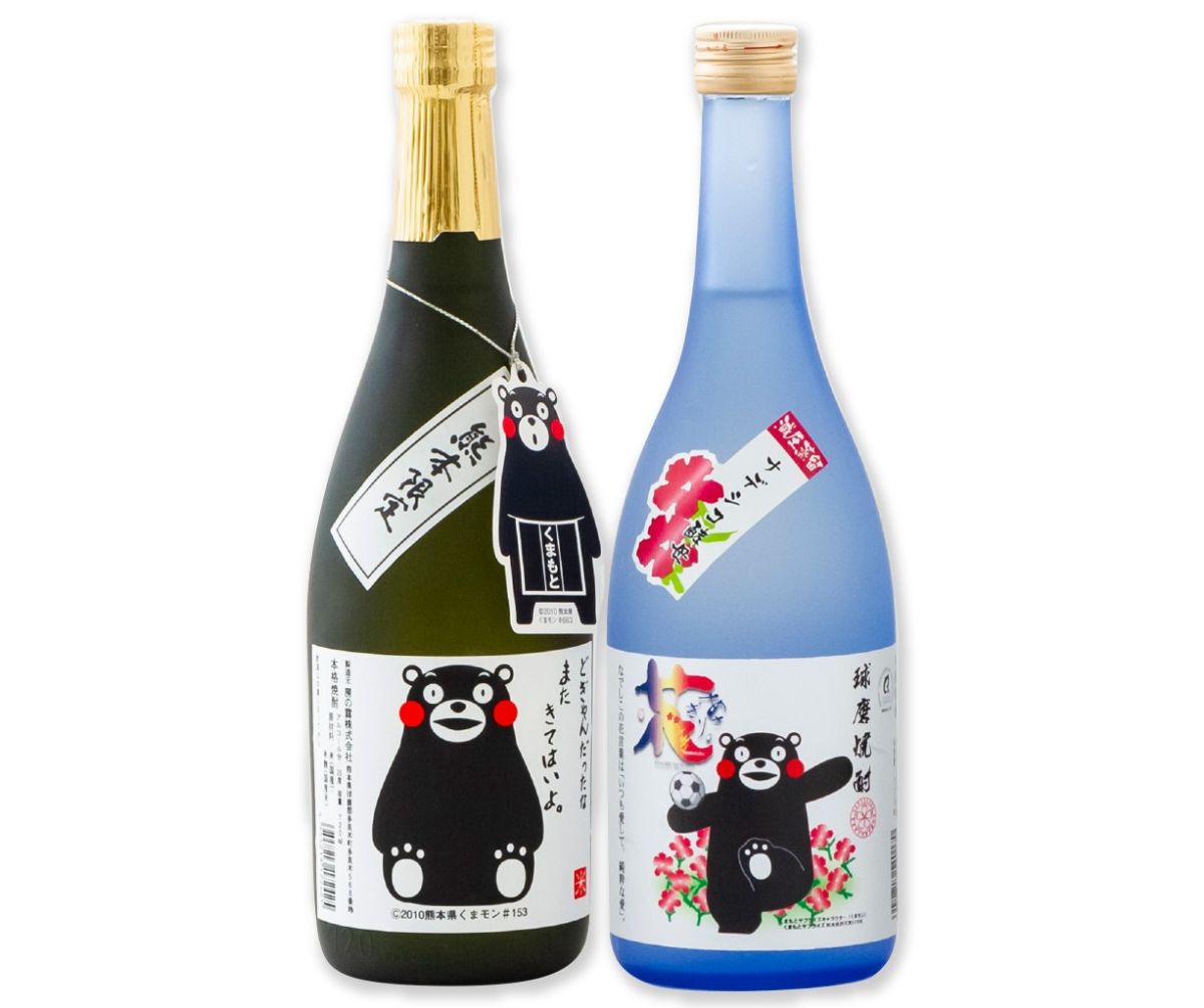 くまモンパッケージの球磨焼酎も! 人吉・球磨地方のみで作られる米焼酎・球磨焼酎。「琉球焼酎 房の露くまモン」720ml 1365円(左)は深みのある味わい、「ナデシコの花酵母」を使用した「球磨焼酎 あさぎりの花」720ml 1980円(右)はフルーティーで華やかな香りです。