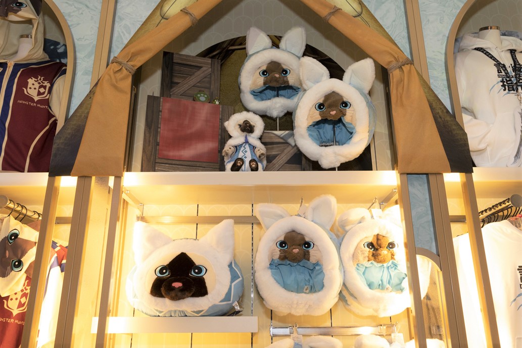 マスコットキャラクターでもあるアイルーの「ぬいぐるみハット」4400円や「カチューシャ」2800円 といったかわいいグッズをはじめ、ゲームに出てくるアイコンのデザインなど、モンスターハンターの世界観を取り入れたクールなアイテムも。