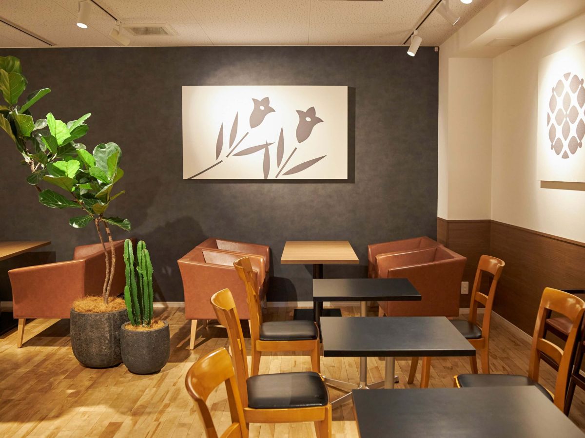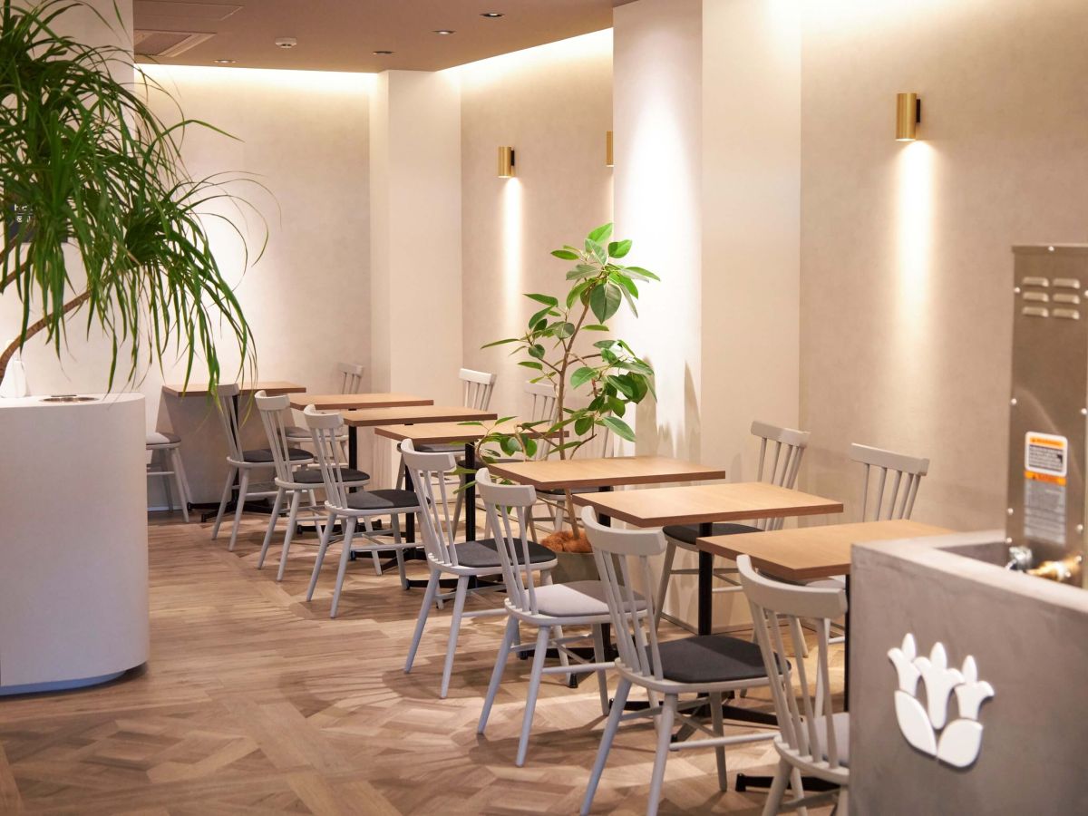 “和と洋の融合”をテーマにした店内には、鎌倉の自然を意識した草木をはじめ、鎌倉市の花でもあるリンドウや、アジサイの文様が効果的に使われています。注文カウンターのあるこの2階のフロアは、白壁や木目の床など質感の違う素材をシンプルに組み合わせたオシャレな空間になっています。