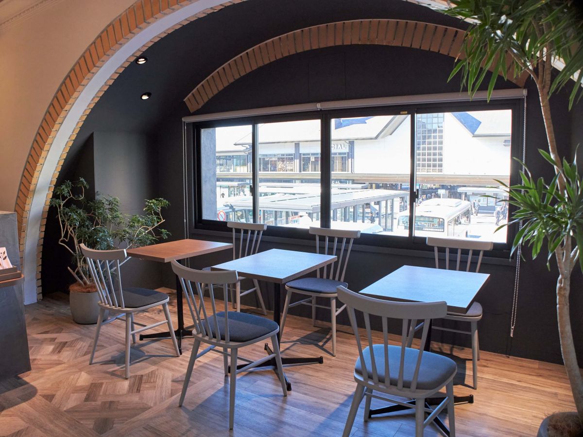窓の向こうにJR鎌倉駅の駅舎が広がるレンガのアーチが特徴的なテーブル席は、特に人気の場所。ライトアップされた優美な駅舎も素敵ですよ。