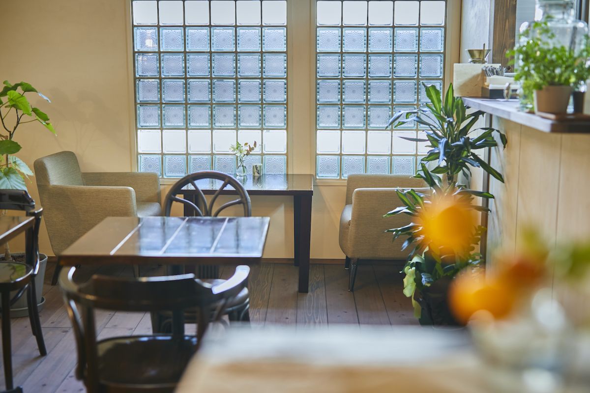 吉村さんが物件を探しているときに「ぱっと目に入ってきて、決め手になりました」というのがレトロなガラスブロックの壁。光を透過させ、やわらかな自然光に満ちた店内にしてくれるとともに、外からの視線を遮断してくれます。