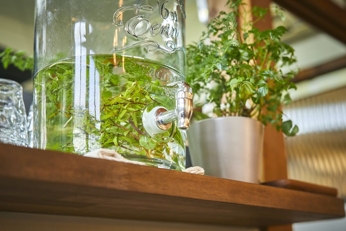 カウンターに置かれた水に入っているハーブは、ビルの屋上で収穫されたもの。屋上では野菜やフルーツも育てているそうです。ハーブの種類はティーツリー。ティーツリーといえば、すっきりとした香りで殺菌・消臭効果のあるアロマというイメージだったのですが、生の葉っぱをかじるとほんのり甘い味がします。
