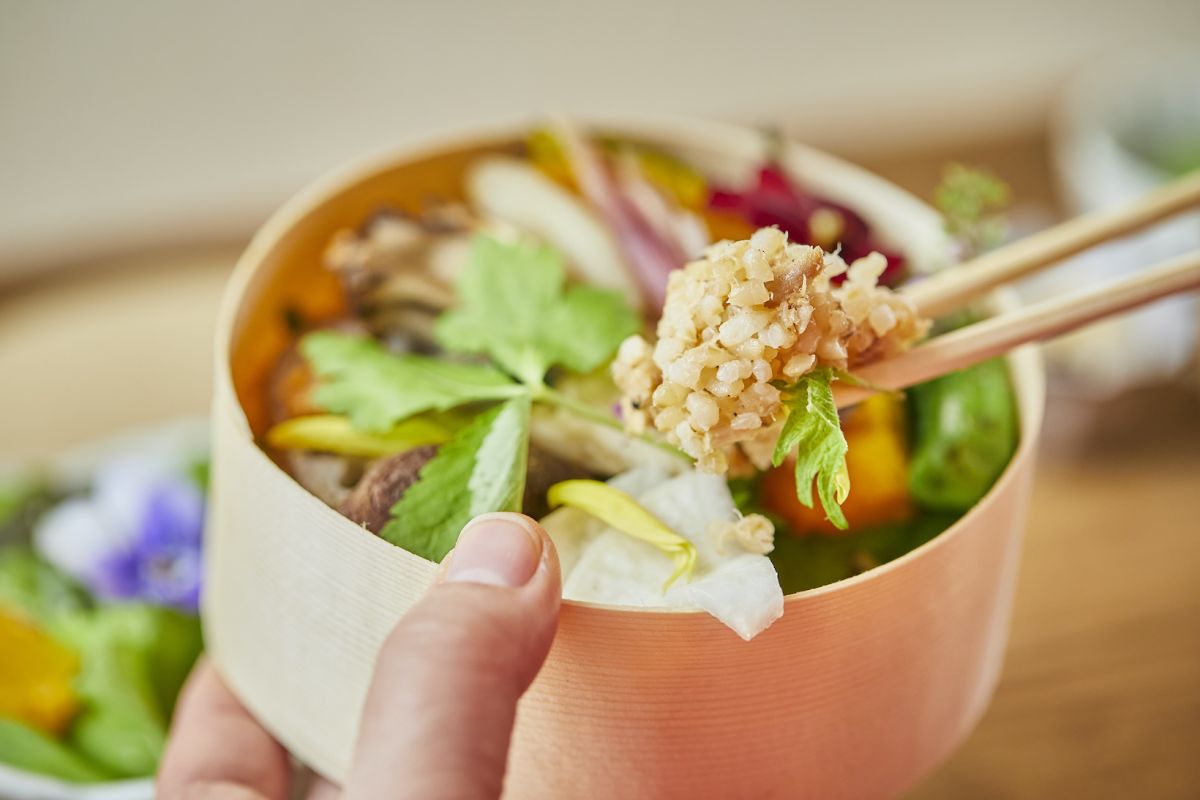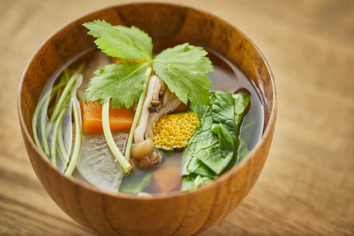 そして、具だくさんのおつゆ。味噌汁にしていないのは、「野菜から出るスープの自然の甘みを感じてほしいから」と吉村さん。名前どおり具だくさんで、にんじん、三つ葉、かぶら、きのこ……とおつゆよりも具の方が多いです。食べておいしいのはもちろん、楽しくなってくるごはん。貴重な体験です。