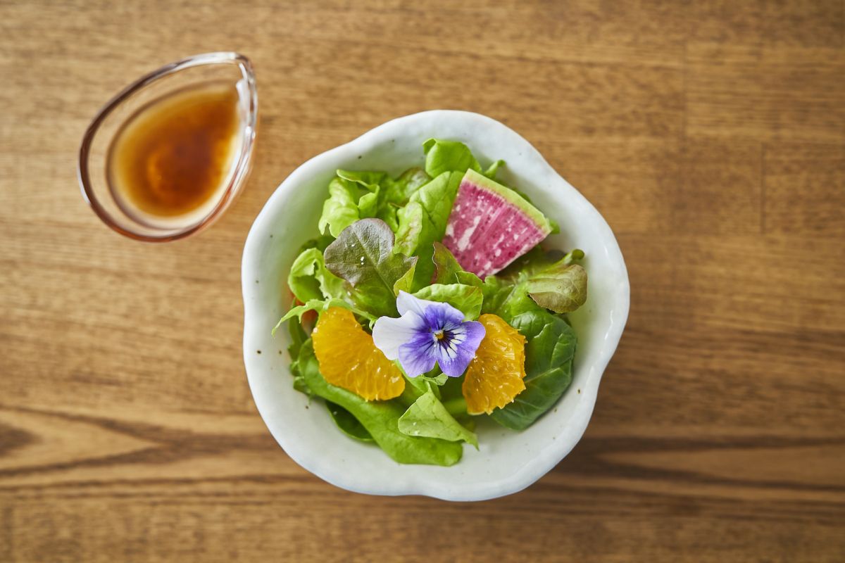 こちらは花の乗った美しいサラダ。奥には旬魚のお刺身が入っています。特筆したいのは、添えられたオイル。吉村さんいわく「なんでも燻製にしてしまう」燻製調味オイルなのです。