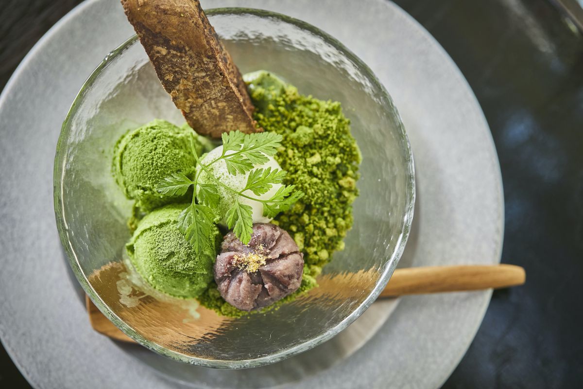 デザートにも店名を冠したメニューがあります。それが「和想日々パフェ」。抹茶かきな粉味を選べるのですが、今回は抹茶をチョイス。京都で江戸時代から続く茶園「上嶋爽禄園」の濃くてうまみのある抹茶を使い、抹茶本来のうまみを感じられるように甘さは控えめに。グラスに敷かれた苔のようなパウダーは、砕いたクッキーに抹茶をまぶしたもの。