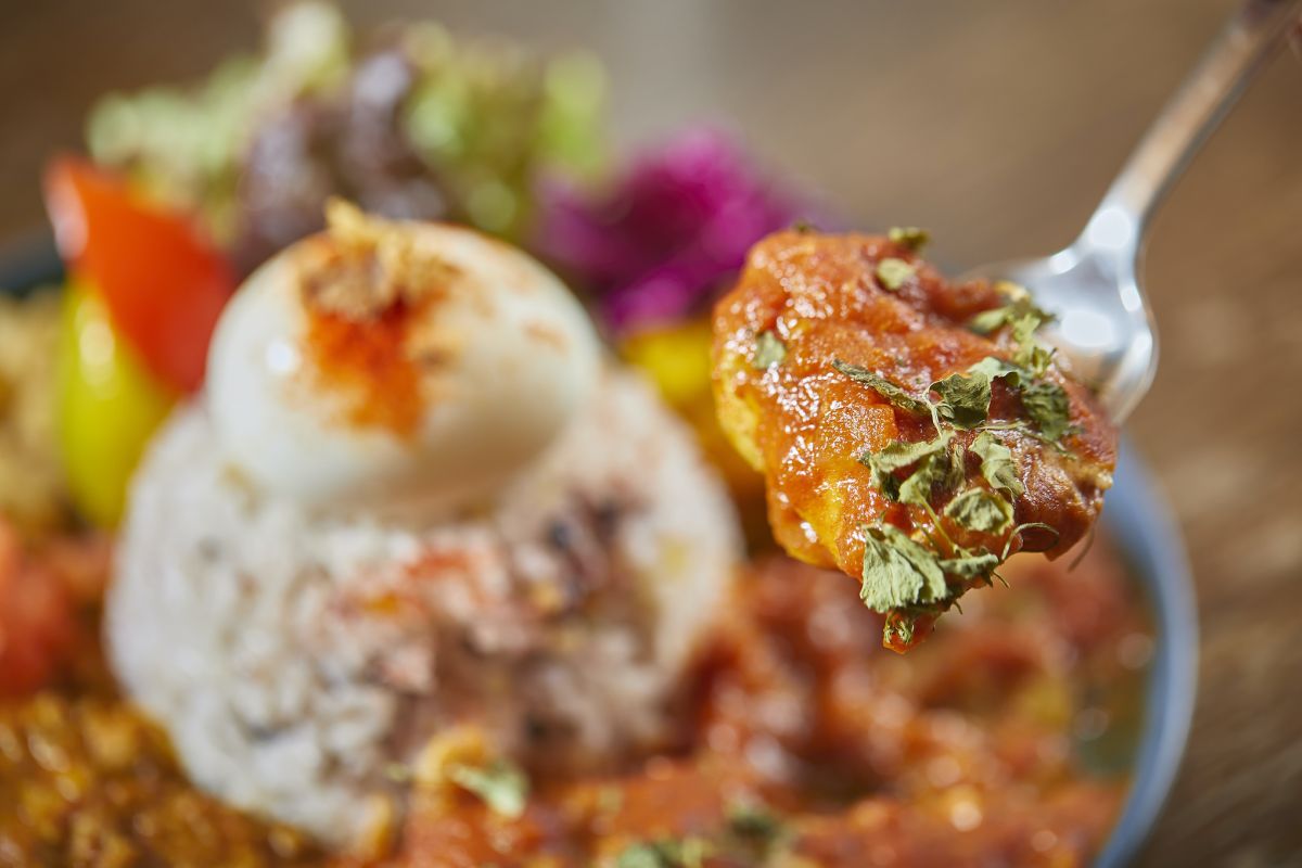 カフェ飯のイチオシは、ポークキーマとバターチキンのあいがけカレー+半熟卵のせ。じゃがいものザブジ(インドの料理でじゃがいものスパイス炒め)などトッピングもうれしい一品です。